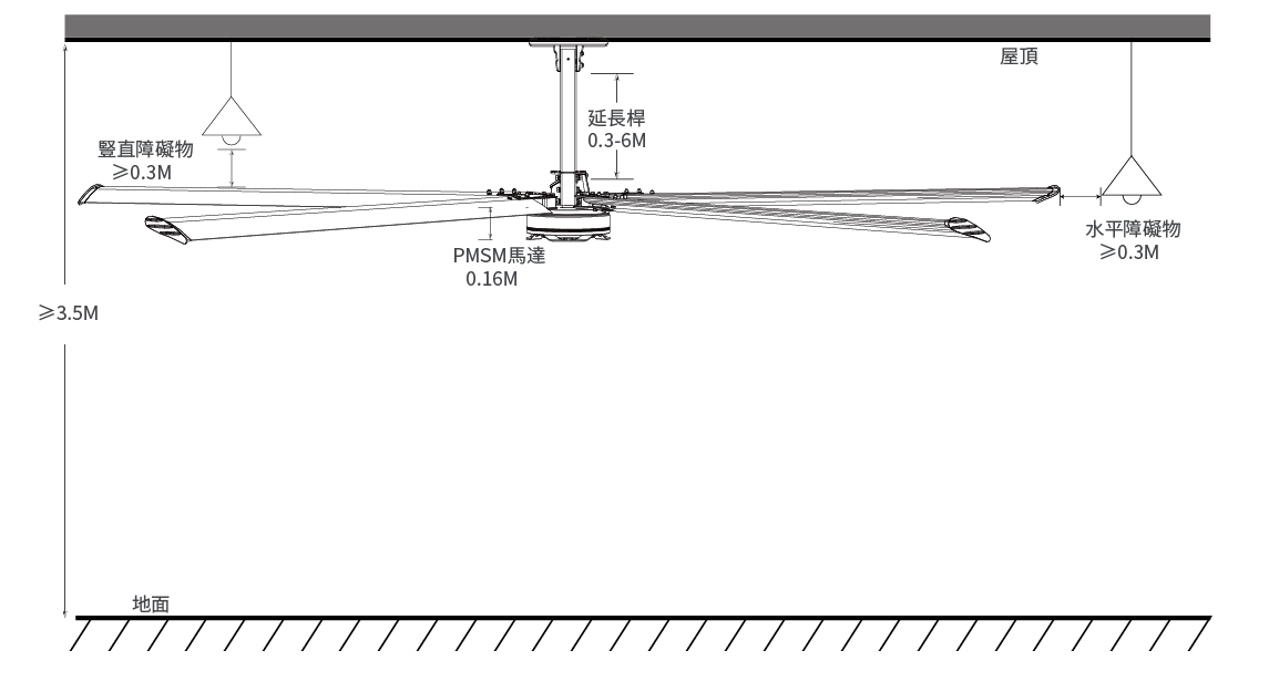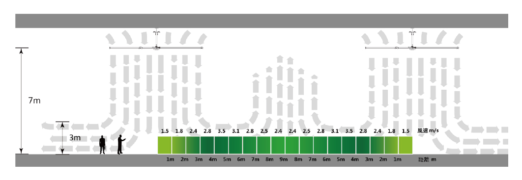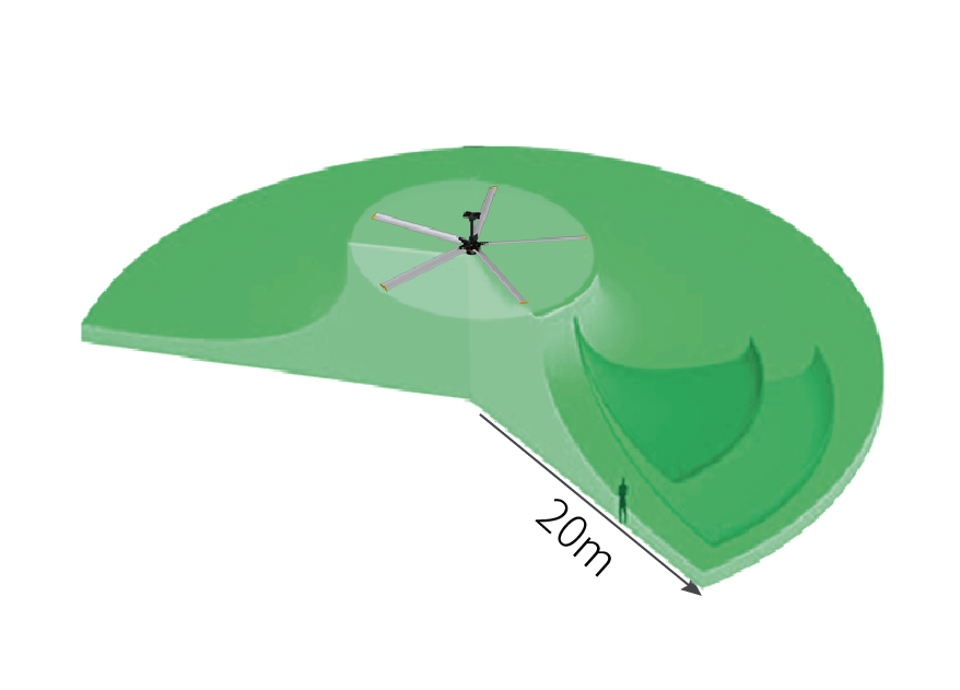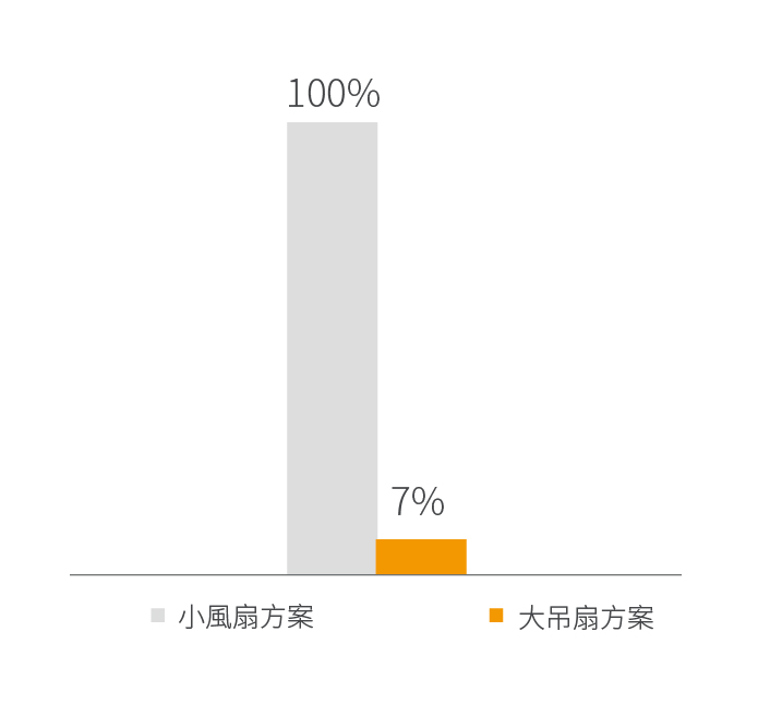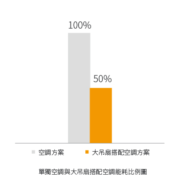 一台直徑7.3m的風行覆蓋面積約等於50台0.75m小風扇的面積,比如在一個9000平方米的廠房裡,希望達到全面覆蓋效果,小型風扇約需要300台;而風行節能大吊扇僅需6台即可。按照使用4年,每年8個月,每日10小時來計算,約共運行了10,000小時,風行耗電78,000kw/hr,小風扇1,080,000kw/hr,節能1,002,000kw/hr,共節省了93%能源消耗。